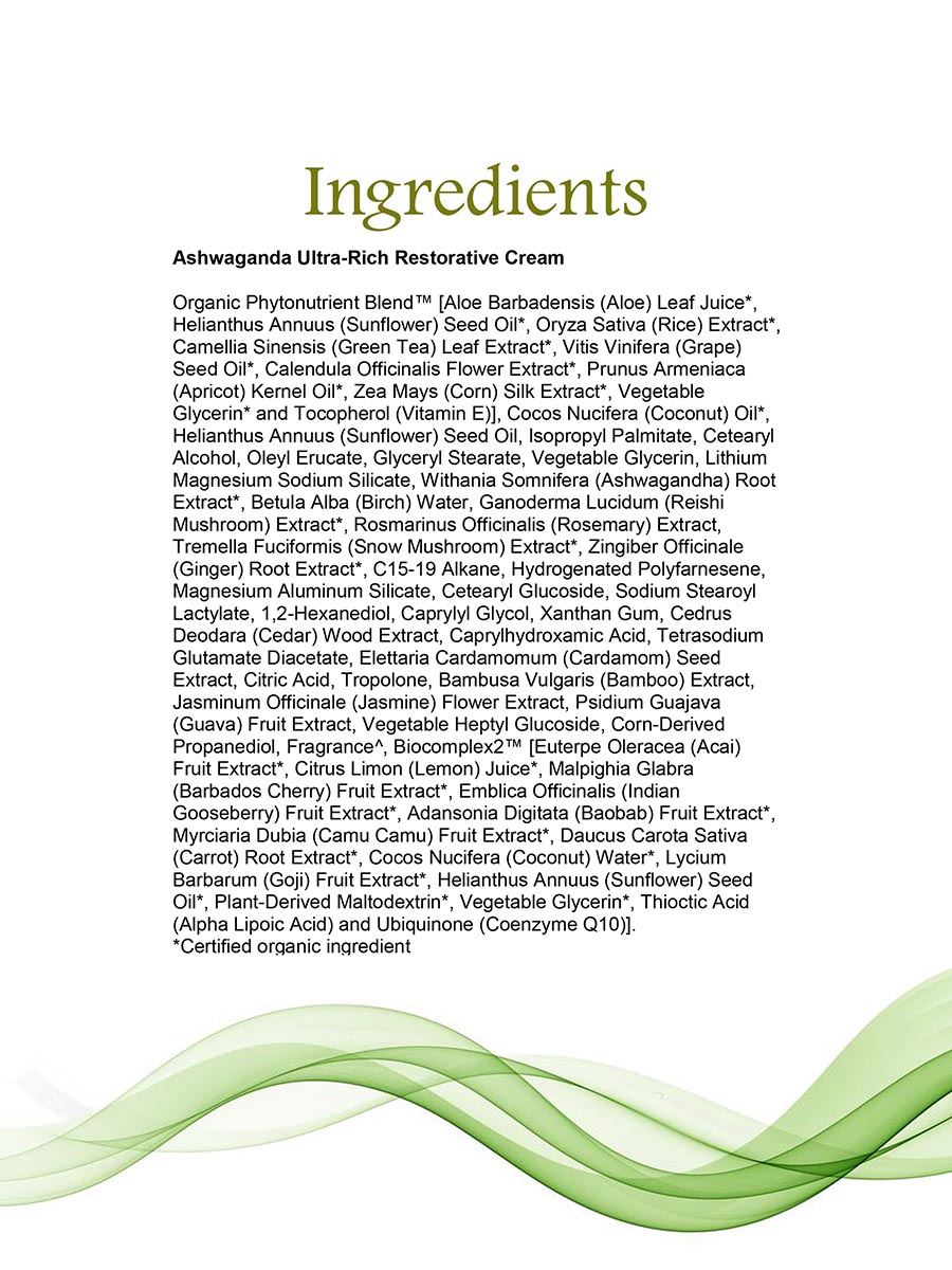 - Ashwagandha Root: antioxidant; helps reduce the visible impact of stress on skin; protects the skin barrier; improves the look of inflammation