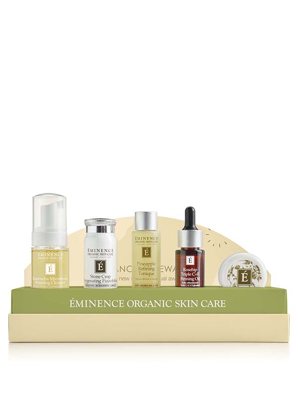 Indulge in a refined skincare experience with this curated ensemble of award-winning Eminence essentials. Each of the five travel-sized treasures is meticulously crafted to transform your daily routine into a radiant ritual of renewal—revealing luminous, glowing skin wherever your journey takes you.